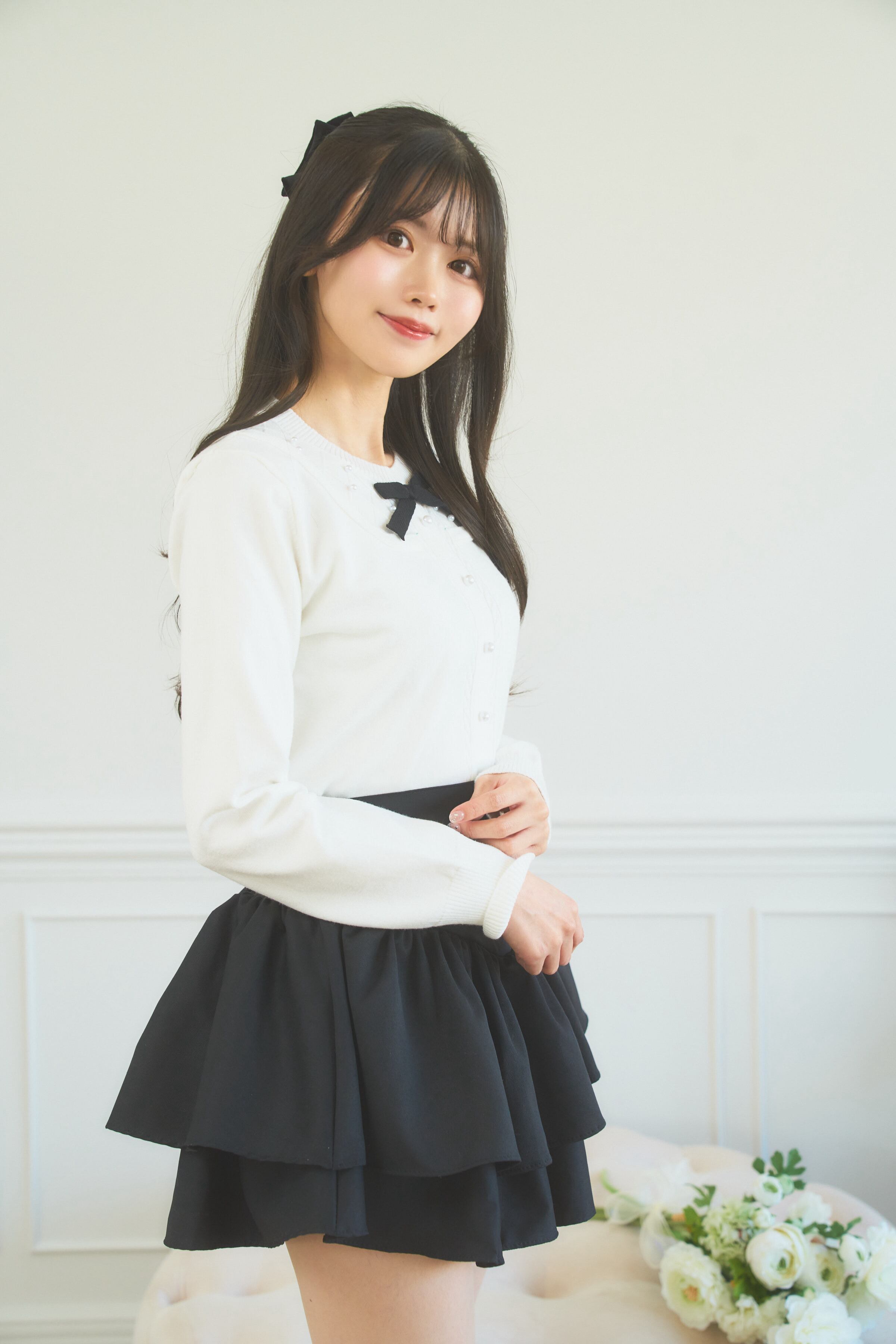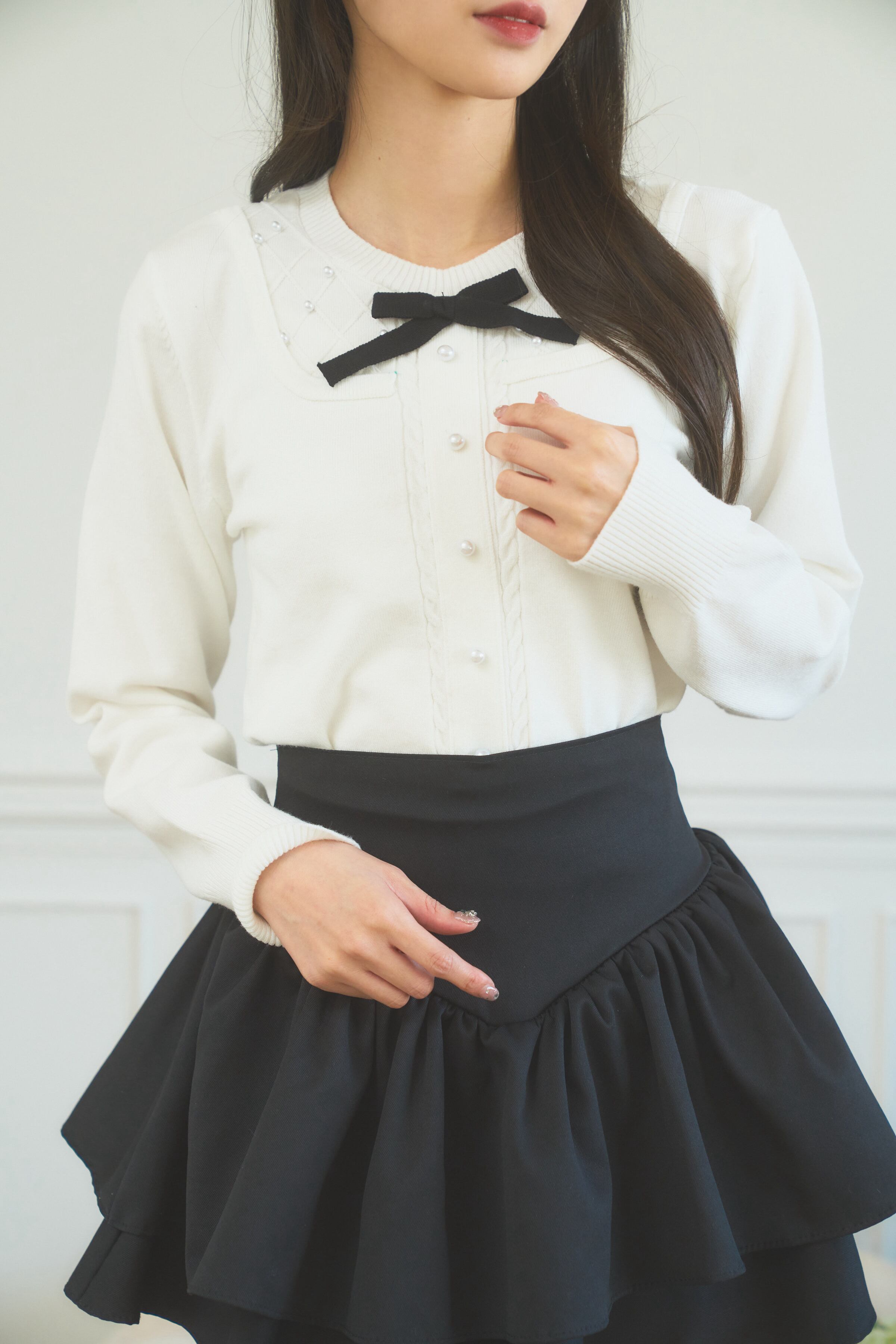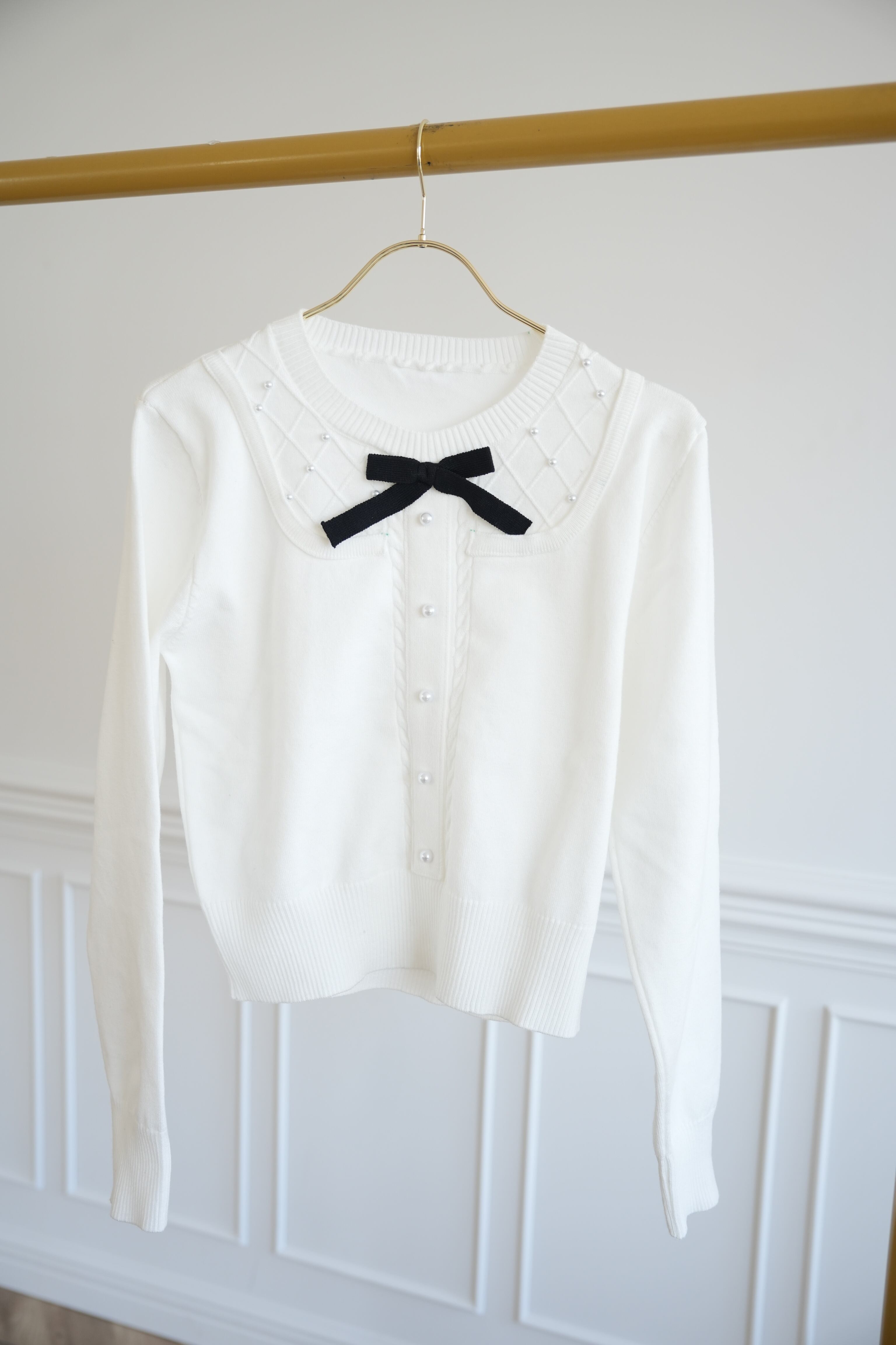パールボタンに華奢なブラックリボンがフレンチガーリーなニットトップス♪ フロントのさりげないケーブル編みや、首回りにあしらったパールもポイント。 モノトーンコーデでシックにまとめてみたり、ワイドパンツやフレアスカートなどボリュームのあるボトムスと合わせればレトロなコーデにも◎