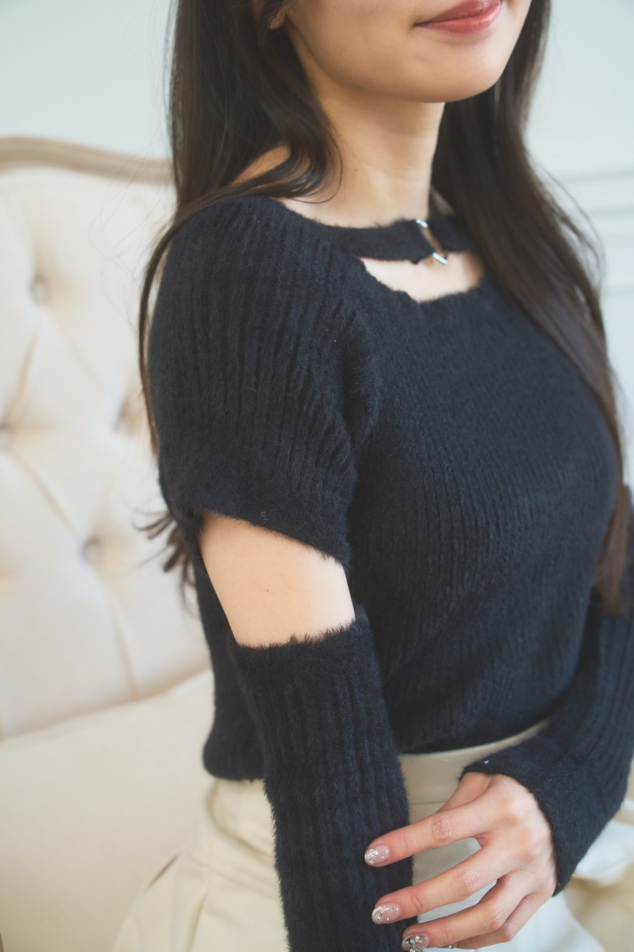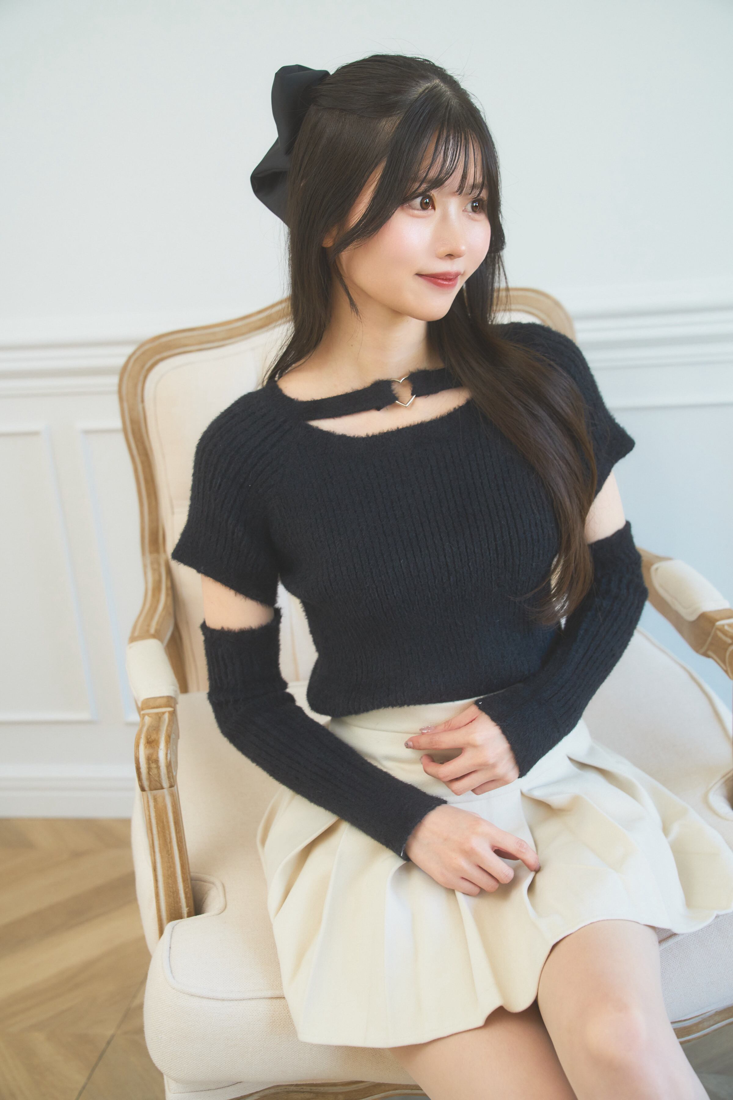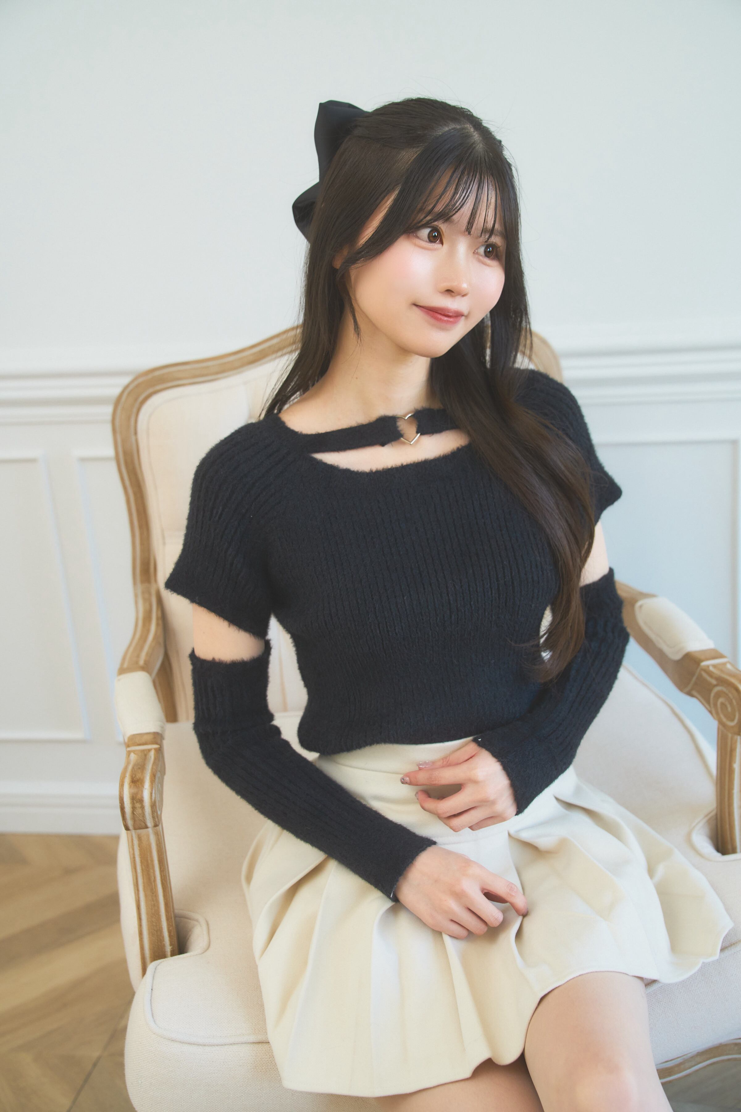 デコルテラインにあしらったハート型のバックルがポイントのモテニット。 柔らかな風合いのニットが女性らしさを引き立てます◎ アームウォーマー付きも嬉しいポイントです。 アームウォーマーを外してハーフスリーブとしても着用できます♪