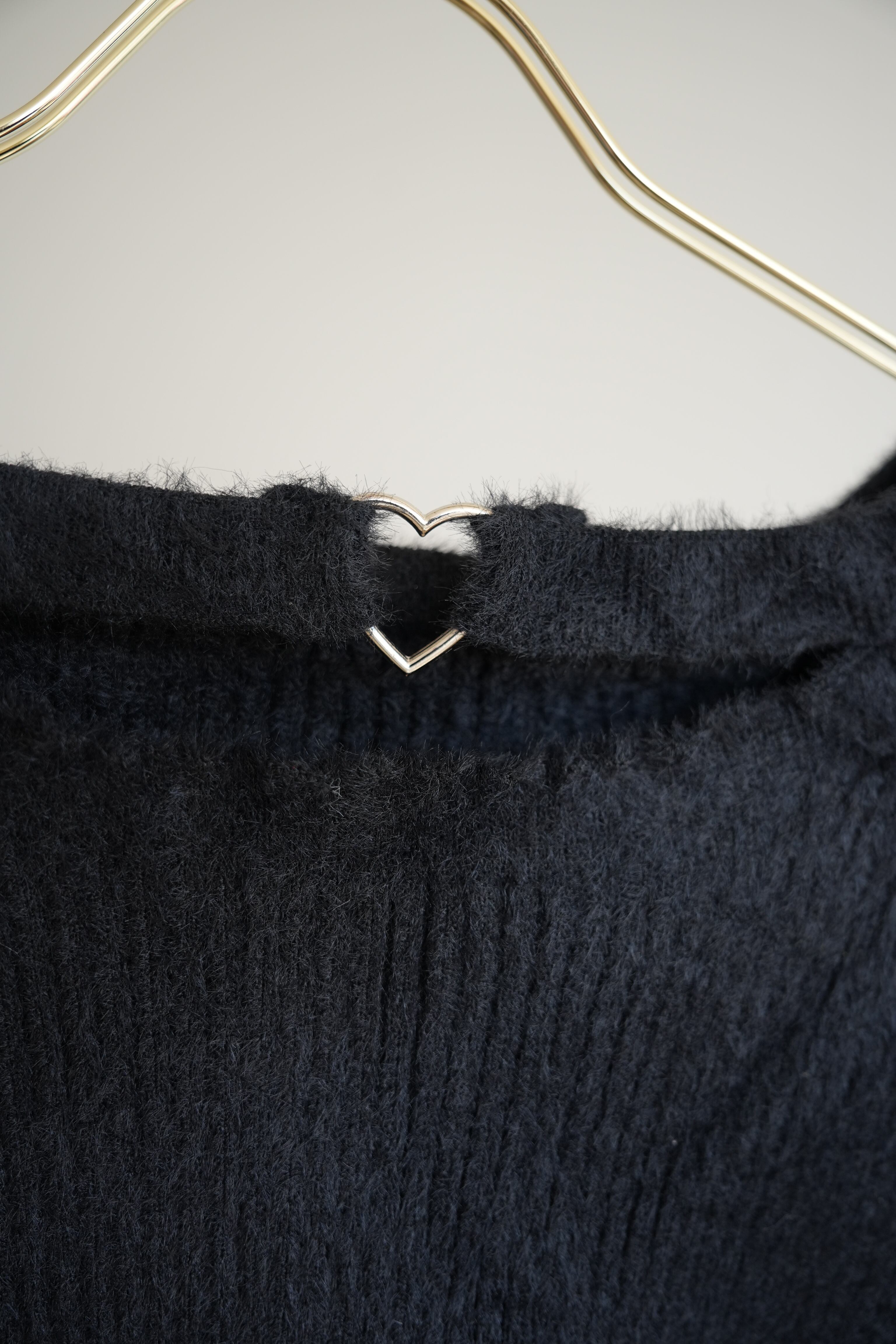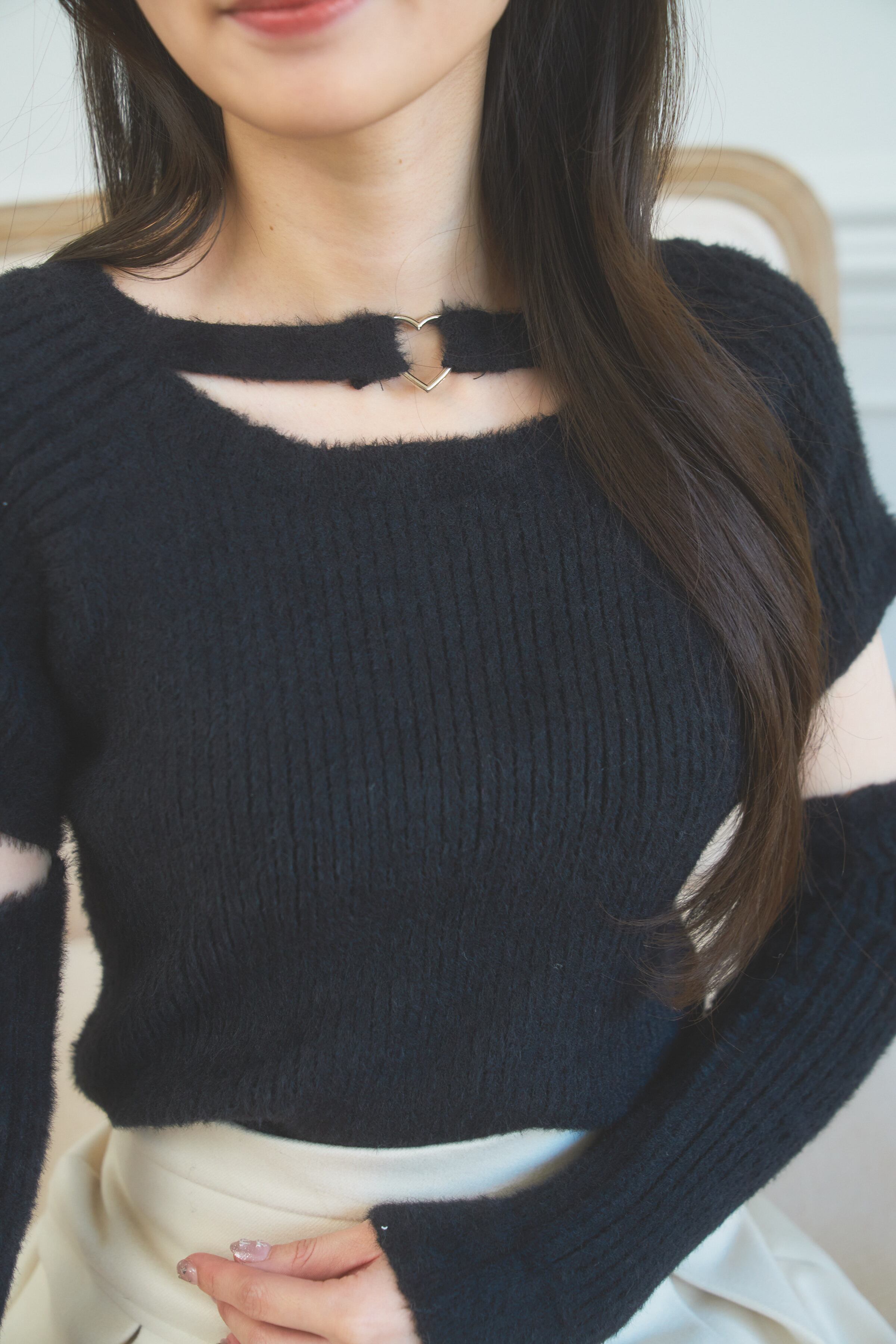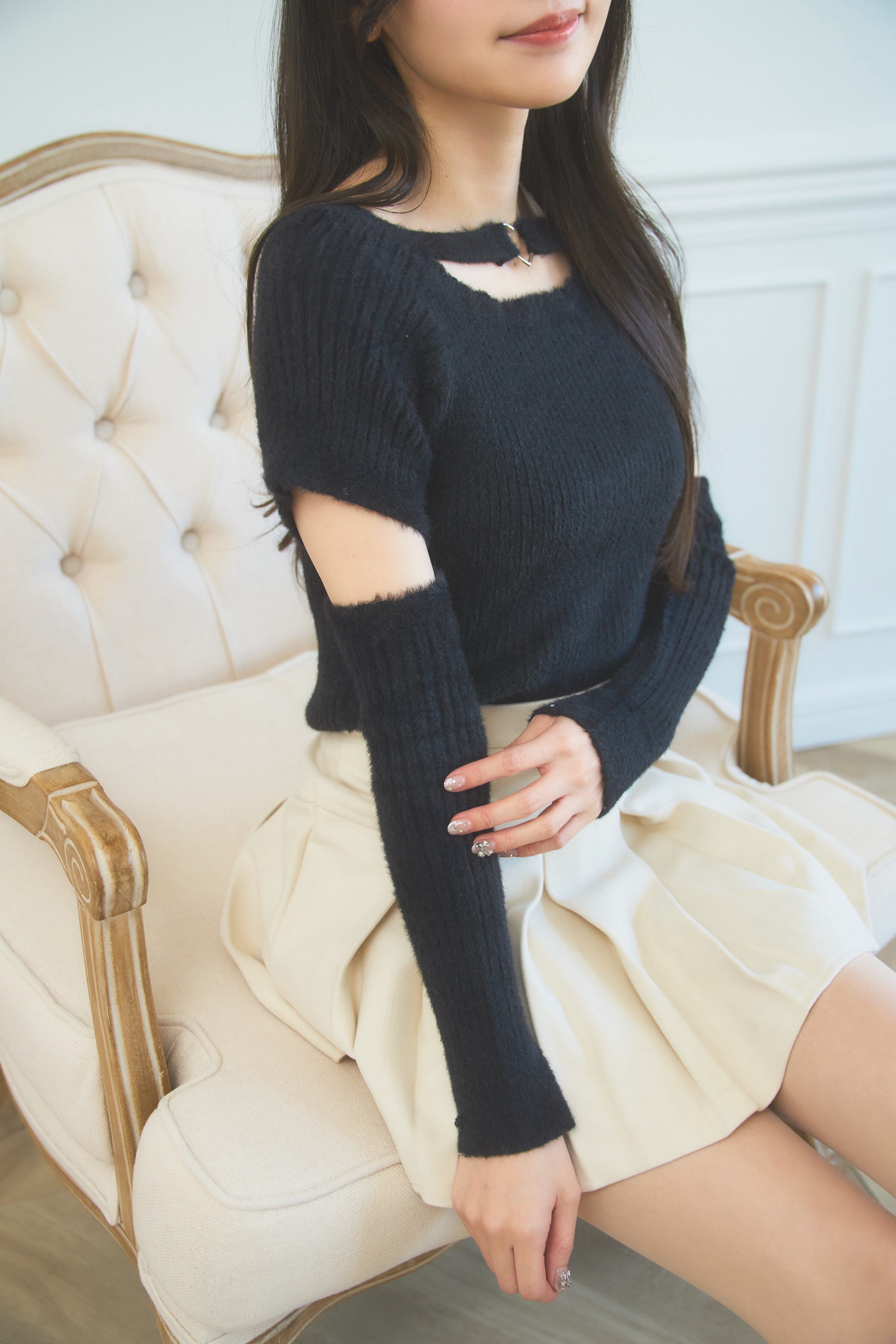 デコルテラインにあしらったハート型のバックルがポイントのモテニット。 柔らかな風合いのニットが女性らしさを引き立てます◎ アームウォーマー付きも嬉しいポイントです。 アームウォーマーを外してハーフスリーブとしても着用できます♪