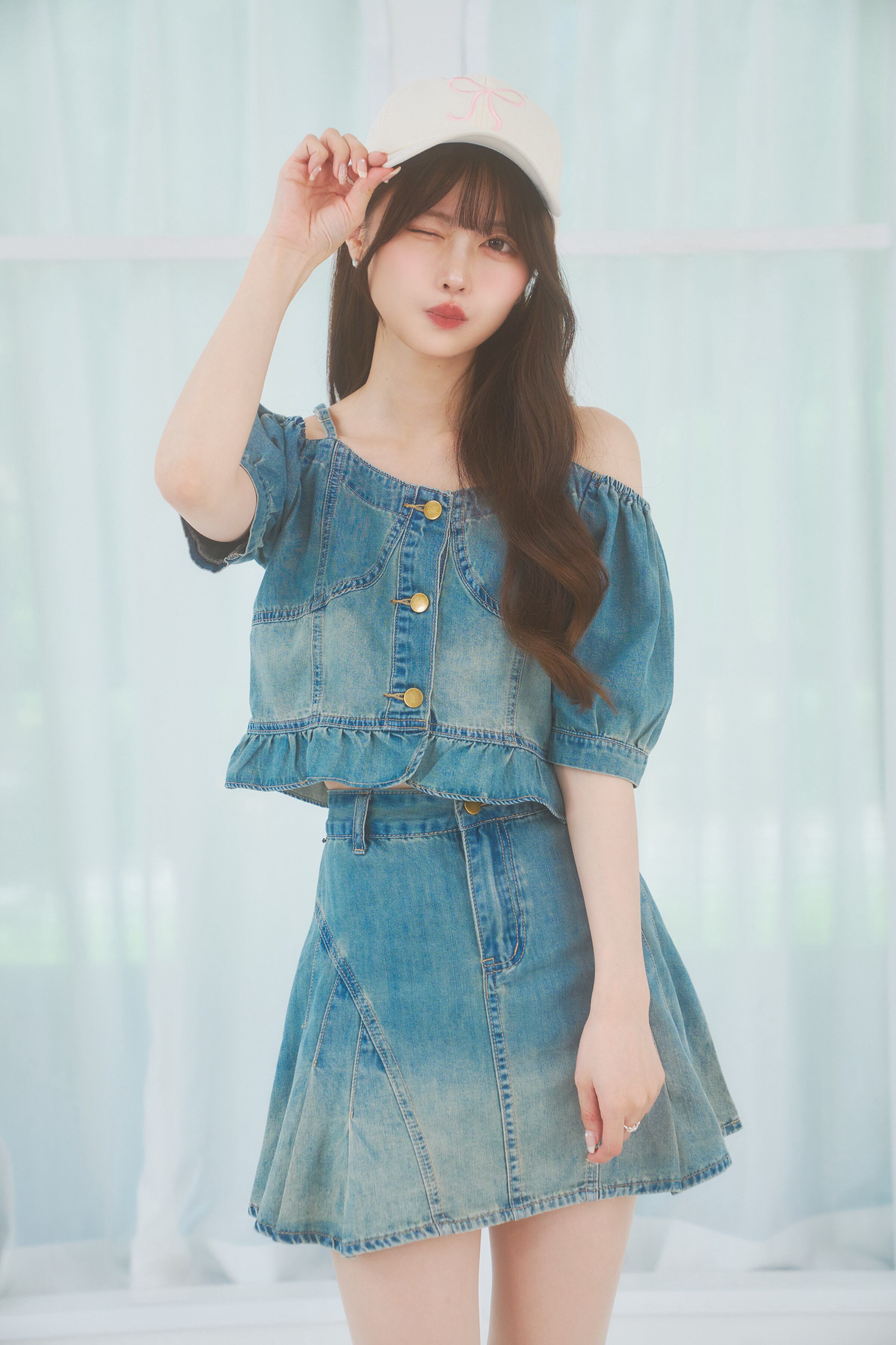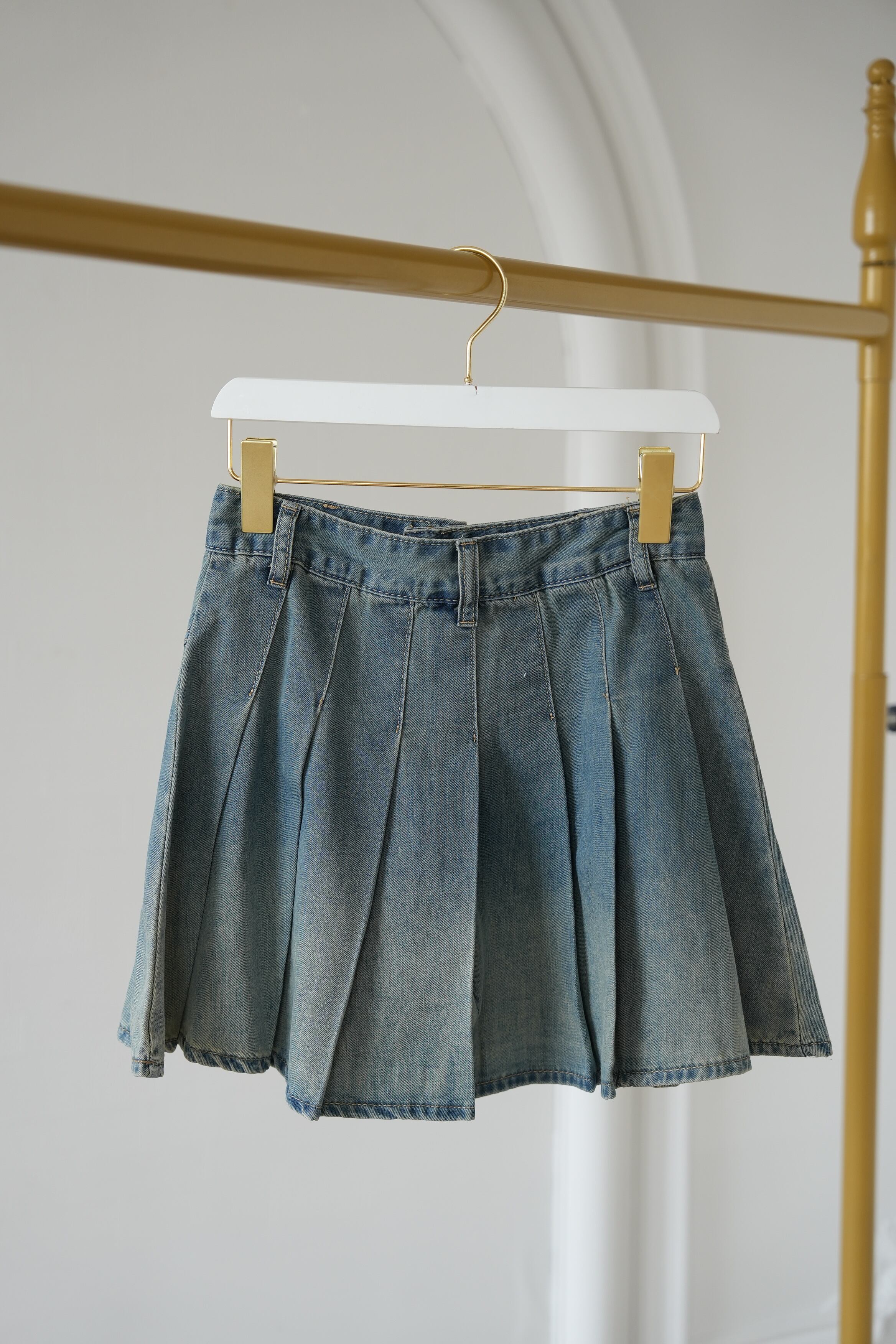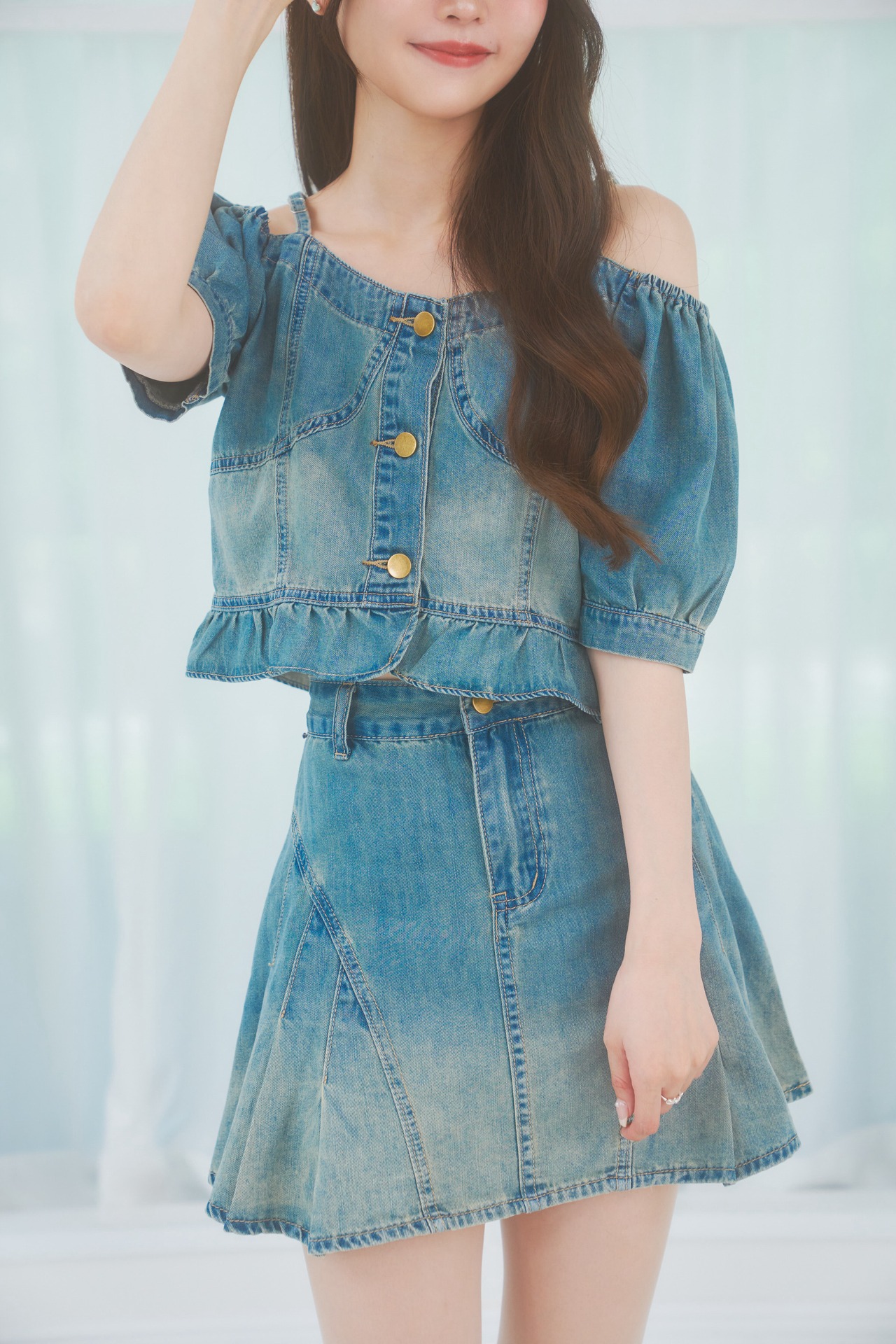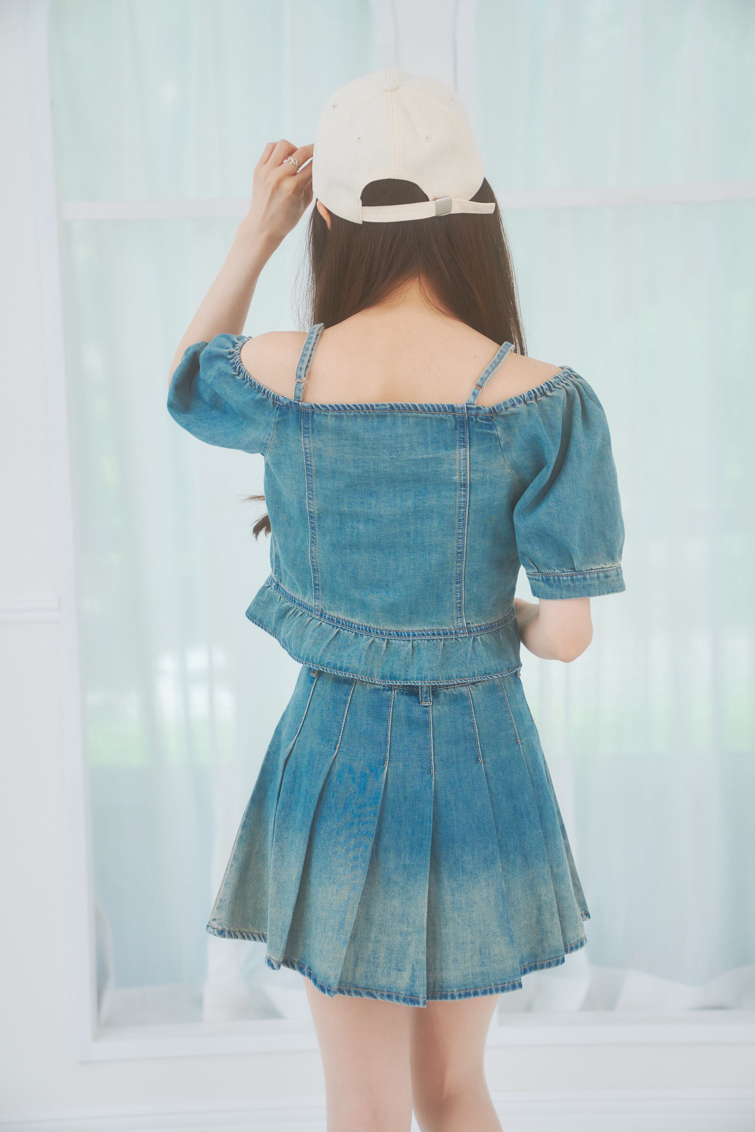 こなれ感のある風合いのデニムトップス+スカートのセットアップ♪ パフスリーブや裾のフリル加工が女性さしさを引き立て、キュートな印象に♪ プリーツスカートは単体でも使いやすいハイウエスト仕様。 フェスや海などレジャーにもおすすめのセットアップです♪